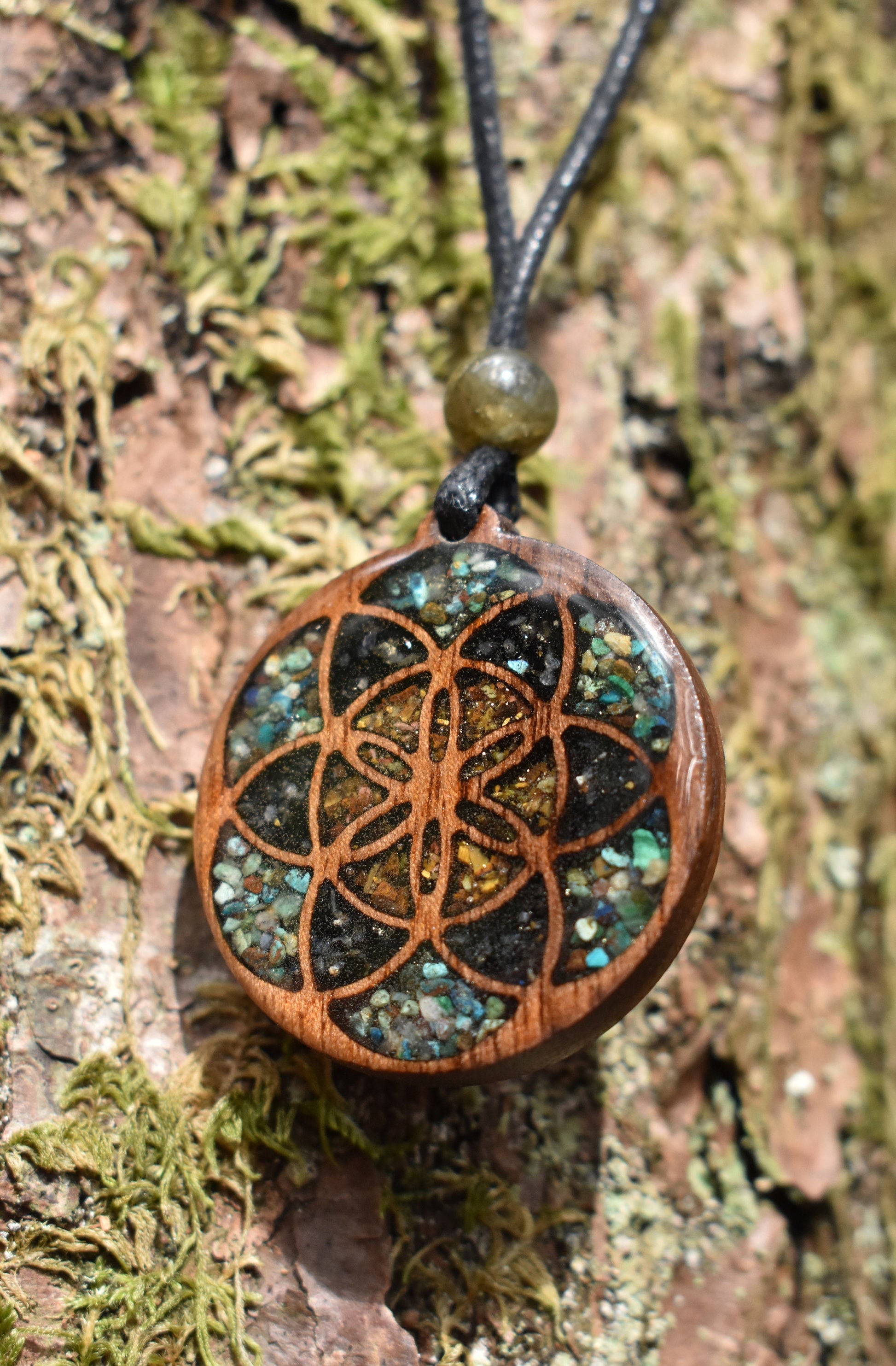 Seed of Life Pendant - Necklace with Phoenix Turquoise - Pyrite - Tigers Eye - Black Tourmaline - Labradorite
